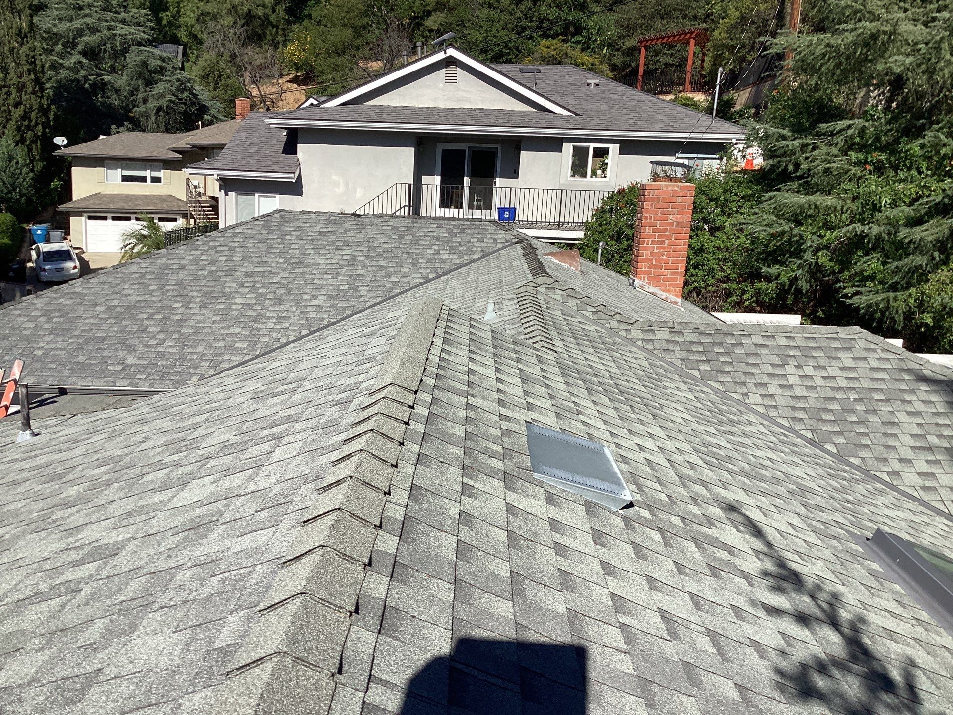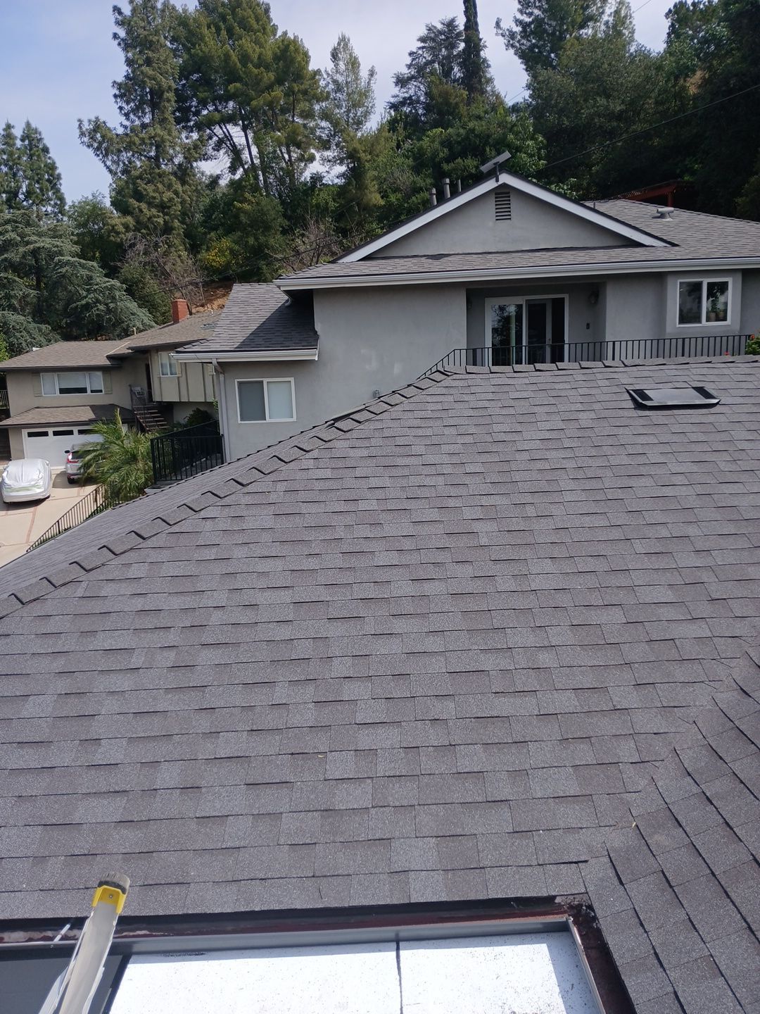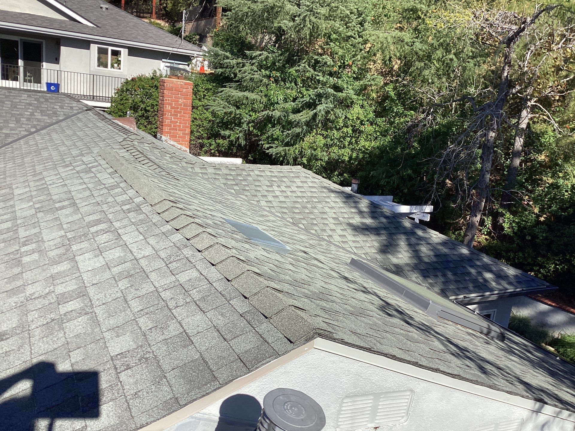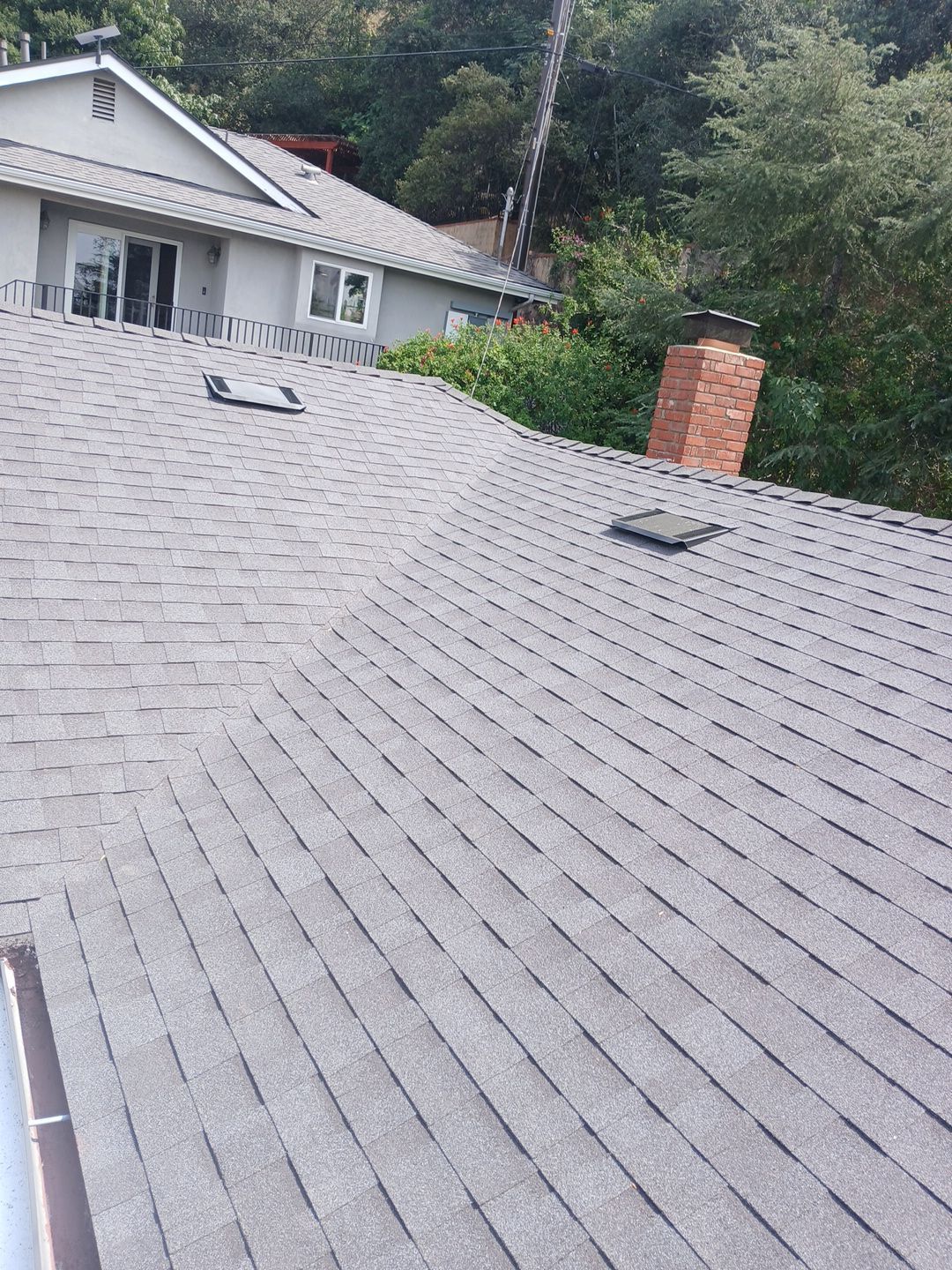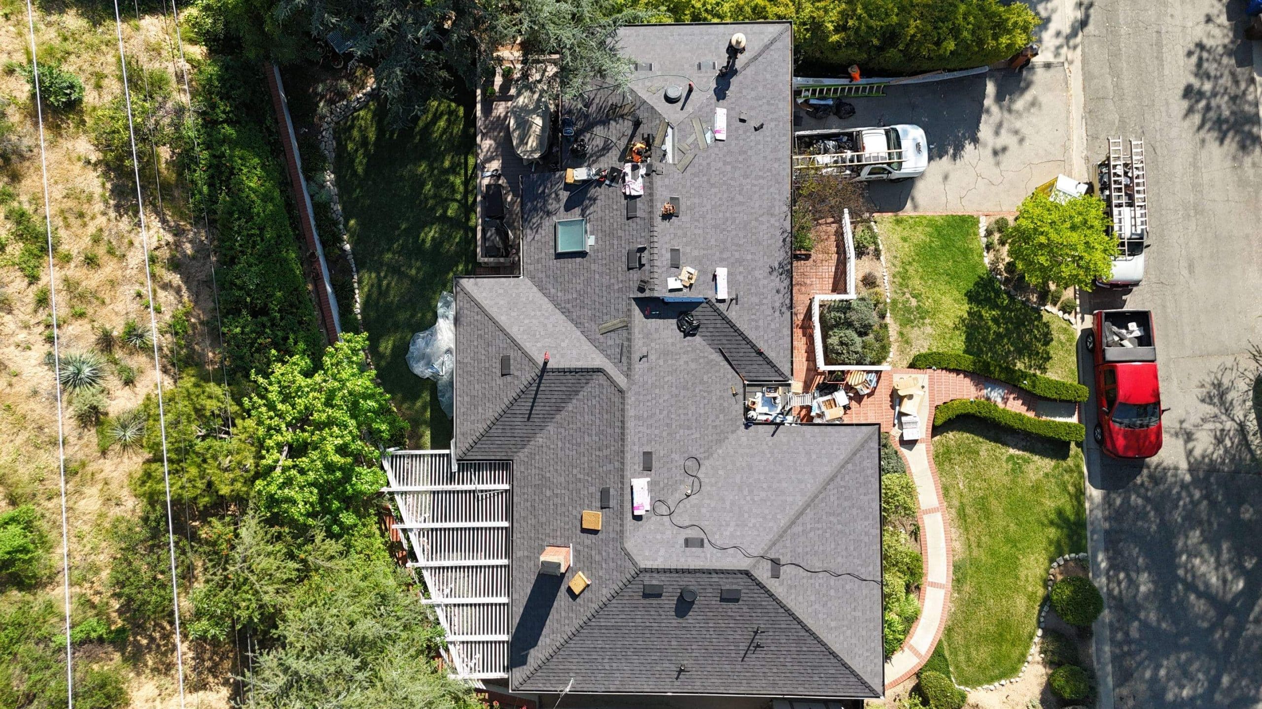 Roof Replacement Inc completed a full residential roof replacement at 5061 Westslope Ln, La Cañada Flintridge, CA 91011, stripping the property down to the roof deck and installing a new shingle system over fire-resistant self-adhered underlayment. The project covered a large, multi-plane hip roof with several valleys, skylights, a brick chimney, and numerous penetrations — all of which were addressed as part of the scope. The finished roof presents clean, uniform lines in a dark charcoal architectural shingle.