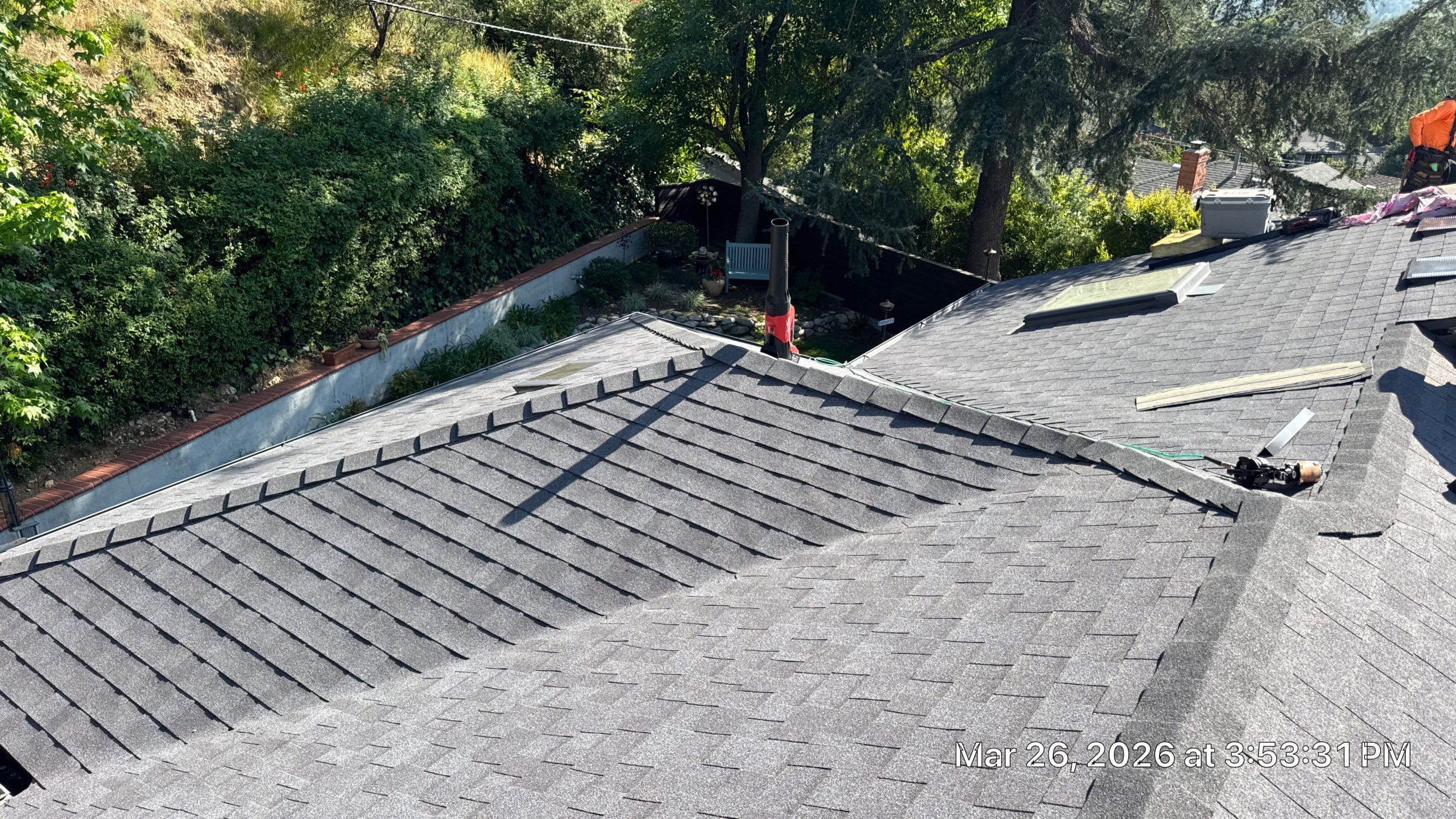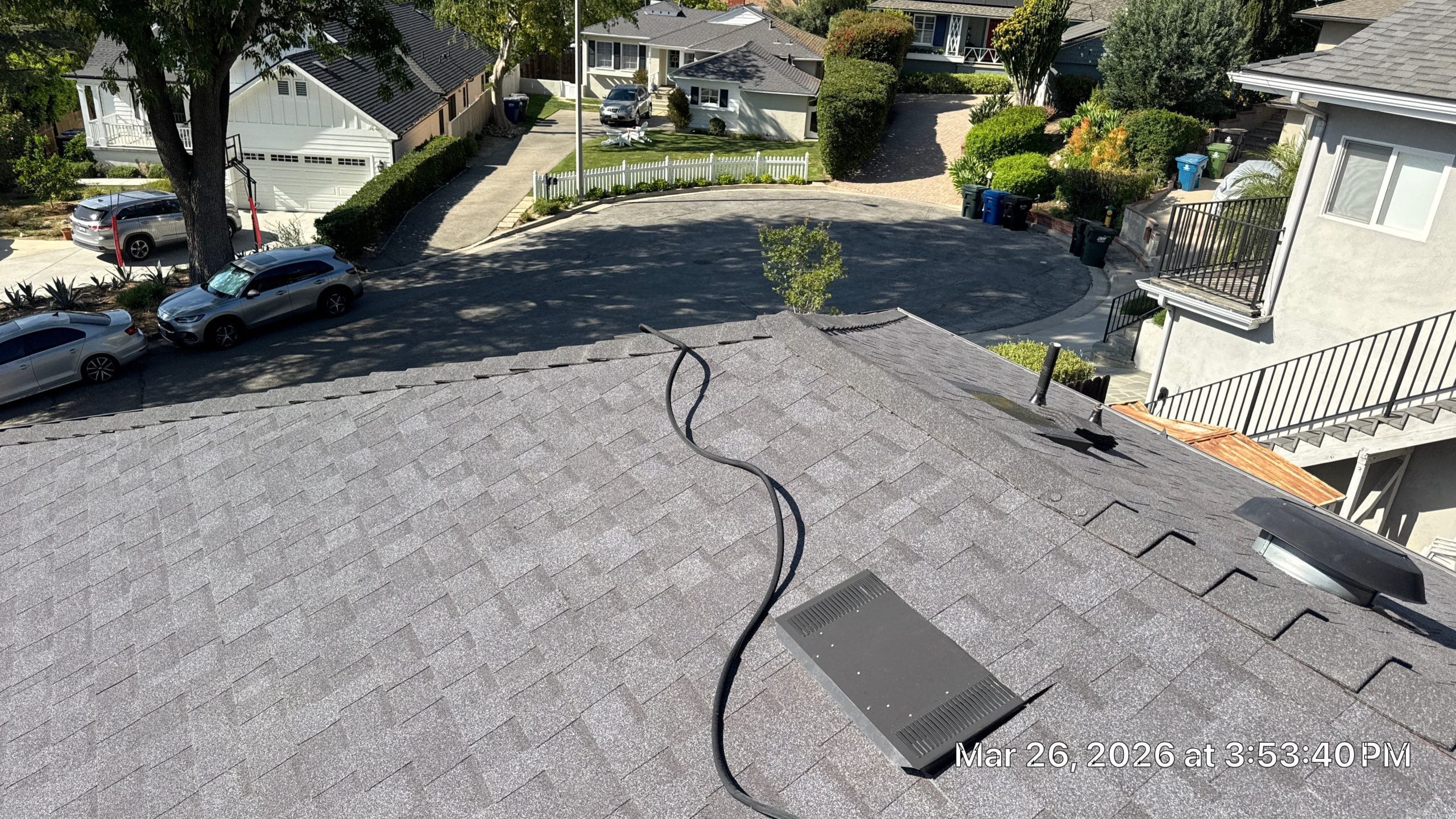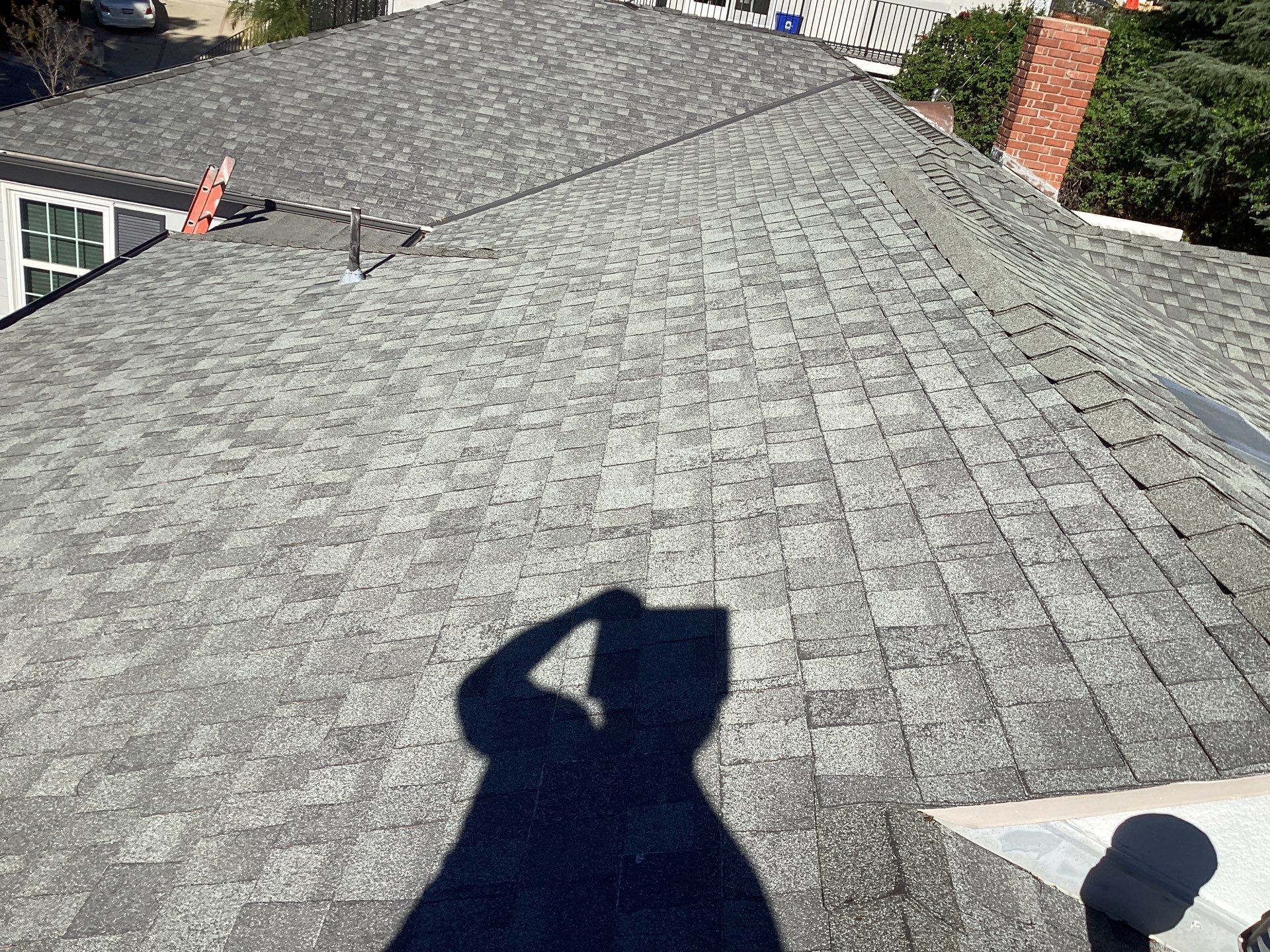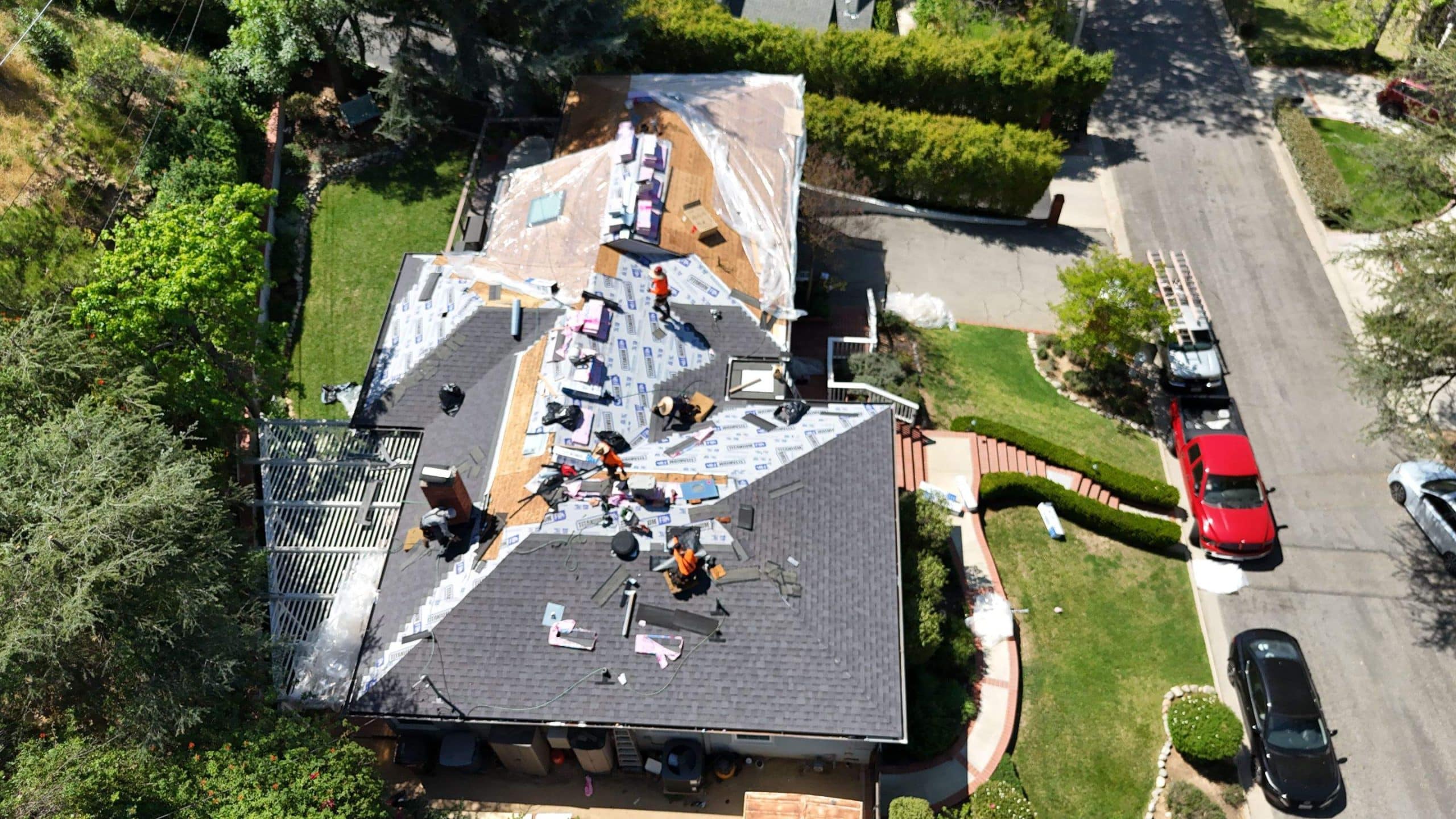 Roof Replacement Inc completed a full residential roof replacement at 5061 Westslope Ln, La Cañada Flintridge, CA 91011, stripping the property down to the roof deck and installing a new shingle system over fire-resistant self-adhered underlayment. The project covered a large, multi-plane hip roof with several valleys, skylights, a brick chimney, and numerous penetrations — all of which were addressed as part of the scope. The finished roof presents clean, uniform lines in a dark charcoal architectural shingle.