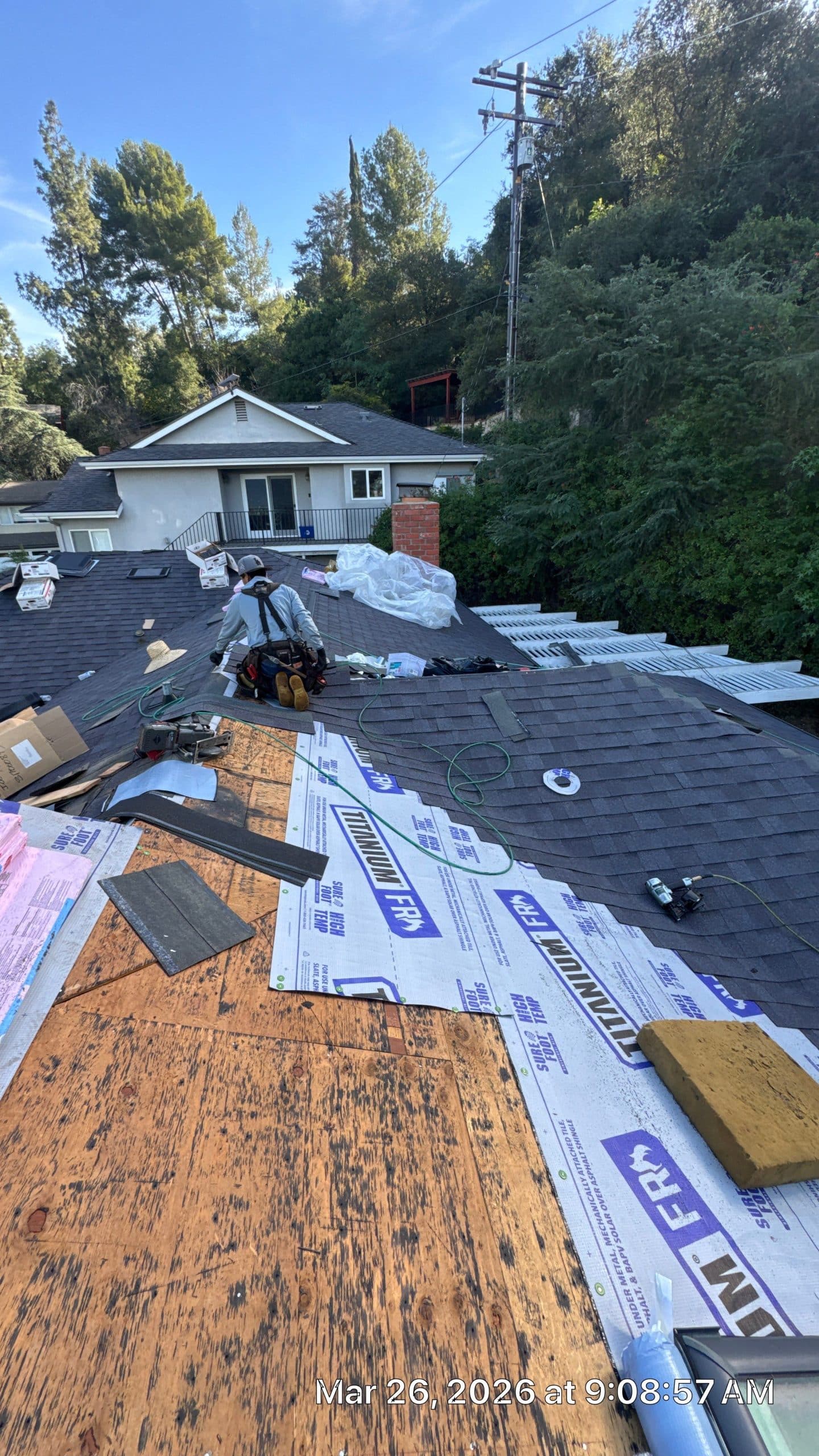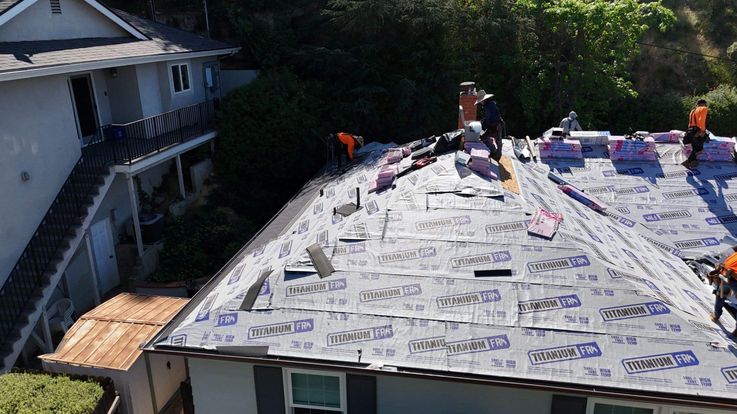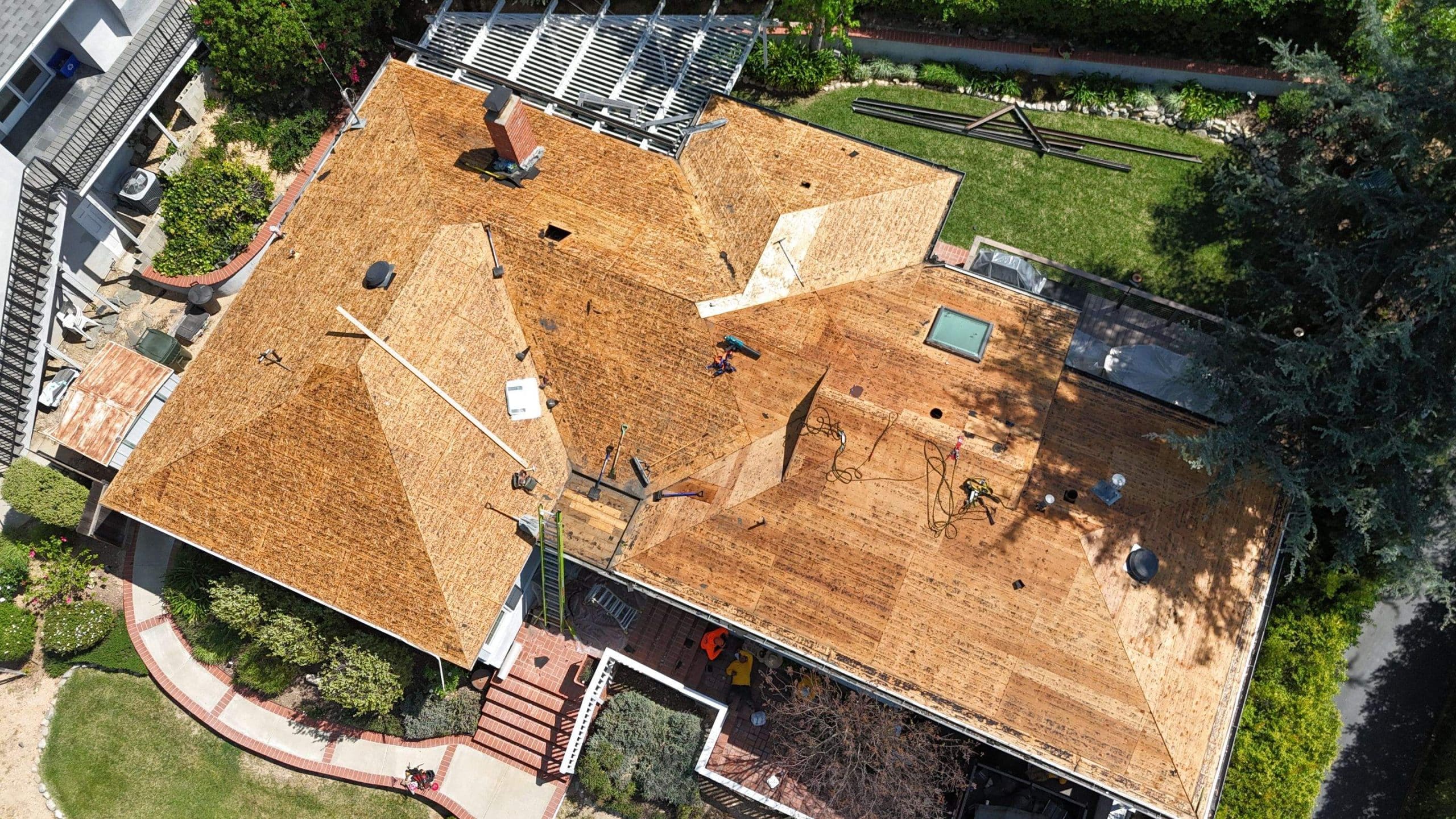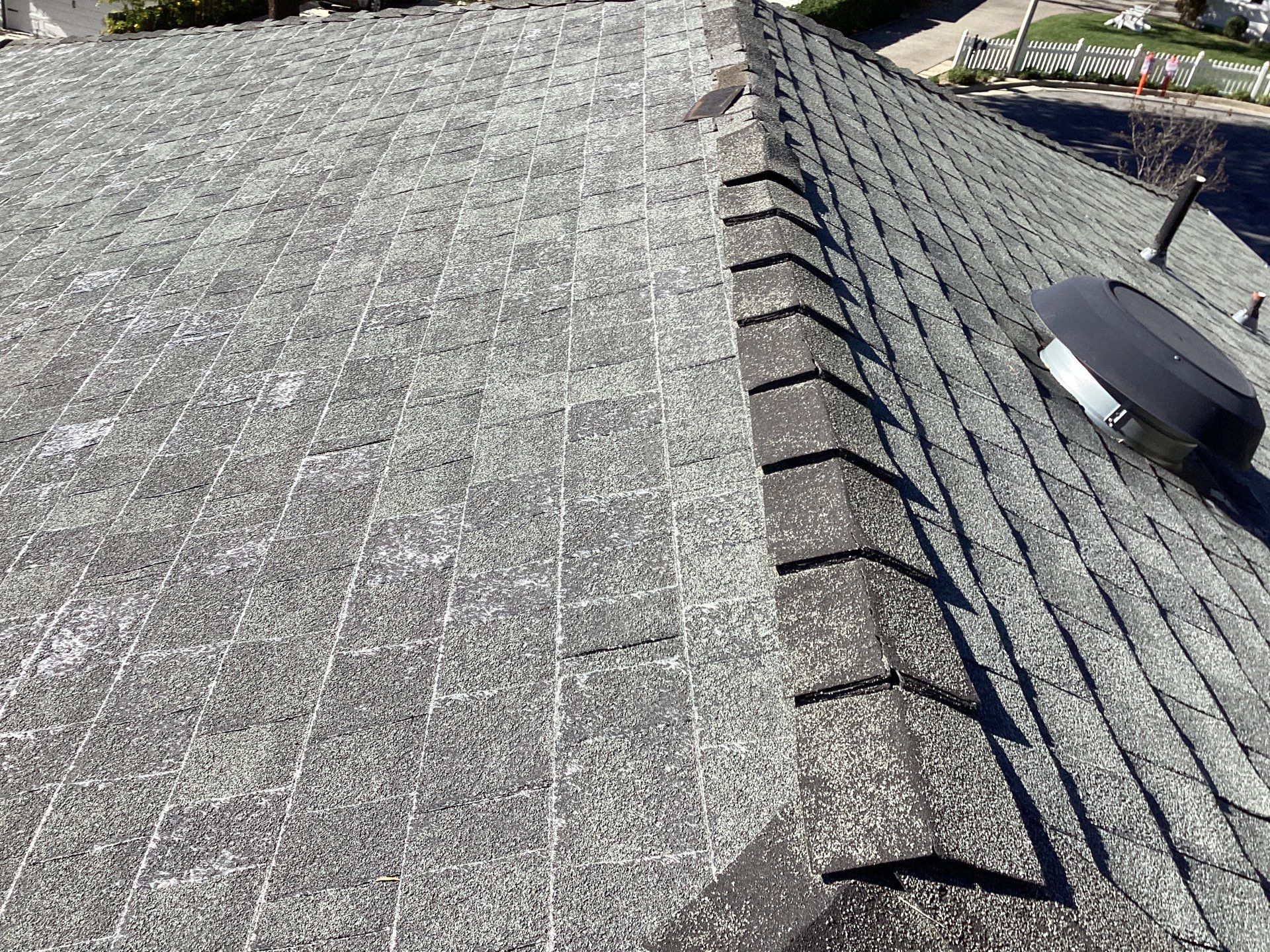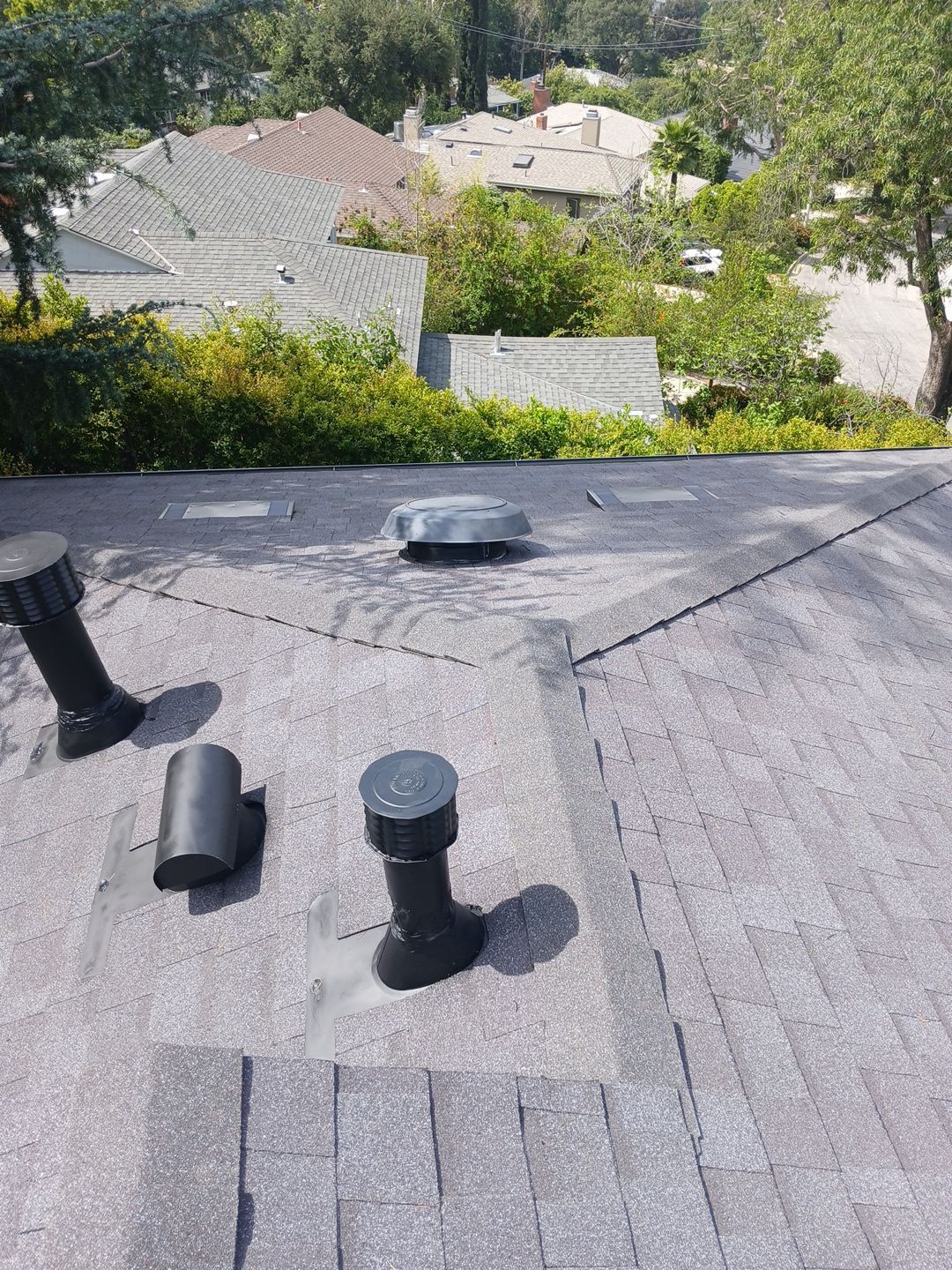 Roof Replacement Inc completed a full residential roof replacement at 5061 Westslope Ln, La Cañada Flintridge, CA 91011, stripping the property down to the roof deck and installing a new shingle system over fire-resistant self-adhered underlayment. The project covered a large, multi-plane hip roof with several valleys, skylights, a brick chimney, and numerous penetrations — all of which were addressed as part of the scope. The finished roof presents clean, uniform lines in a dark charcoal architectural shingle.