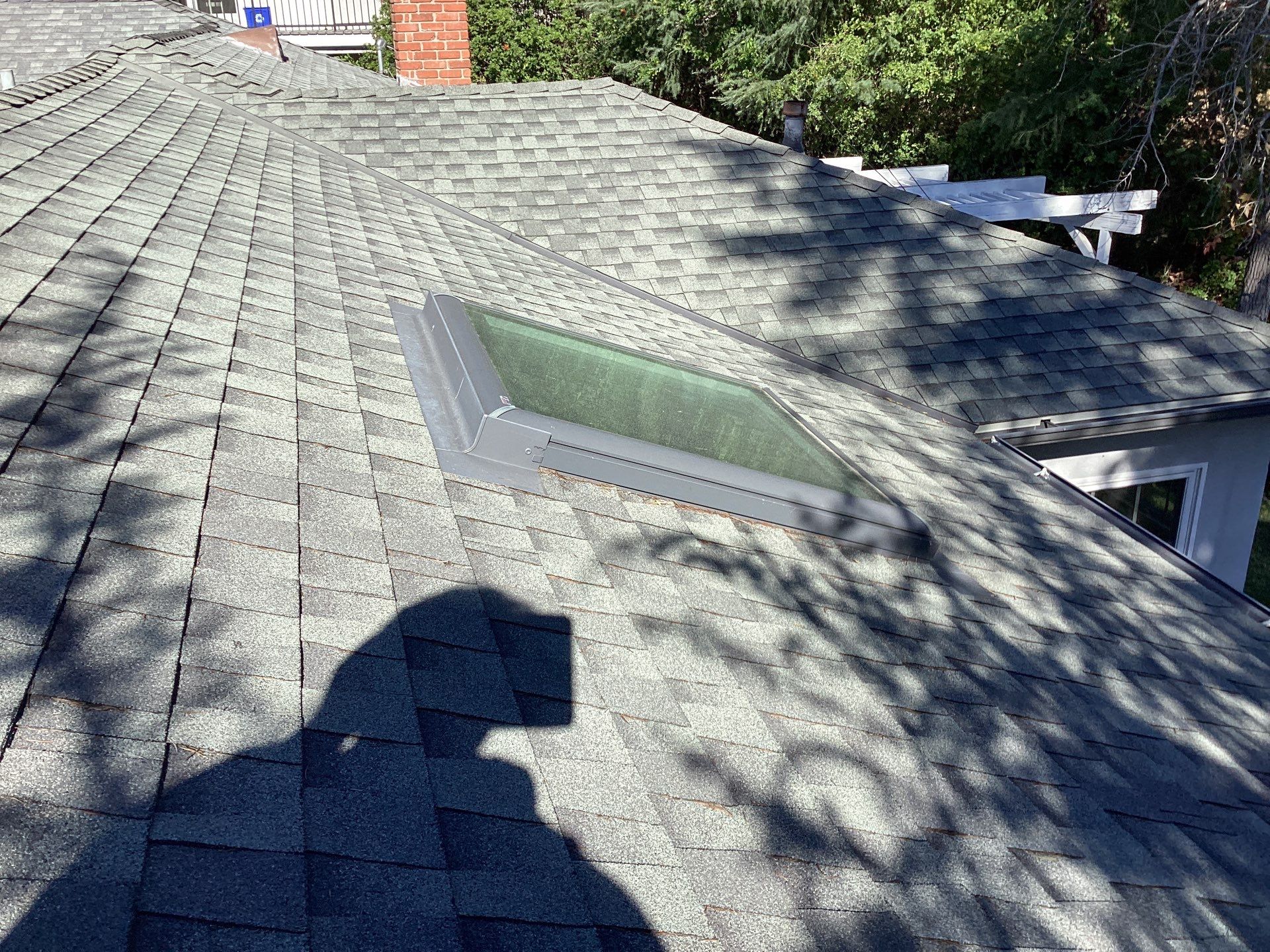 The property has multiple skylights set into the roof at varying orientations, and each received new step flashing and counter-flashing integrated with the shingle courses. Photos taken after completion show the skylight curbs sitting cleanly within the new shingle field with metal flashing visible at the upslope and side legs. Hip caps were installed along all rake and hip lines using cut shingles, and drip edge metal was set at the eaves and rakes. The crew photographed the finished surfaces from multiple angles, including drone-level aerials, confirming complete coverage across all roof sections before demobilizing.