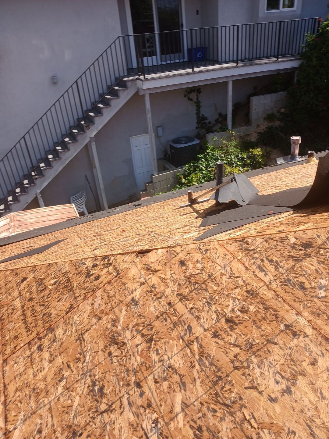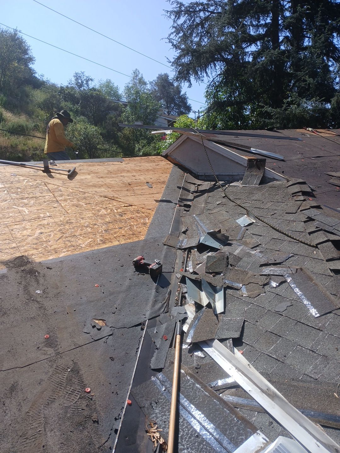 The crew removed the existing shingle layer across the entire roof, including flashing, pipe boots, and accessory vents. Workers used roofing shovels and were observed using safety harnesses and anchor lines throughout the steep-slope tear-off, consistent with fall-protection requirements. Once stripped, the full OSB deck was exposed and inspected; aerial photos show a large portion of new OSB panels installed to replace deteriorated sections before any underlayment was applied. Debris was staged and removed progressively as the tear-off moved across the roof planes.