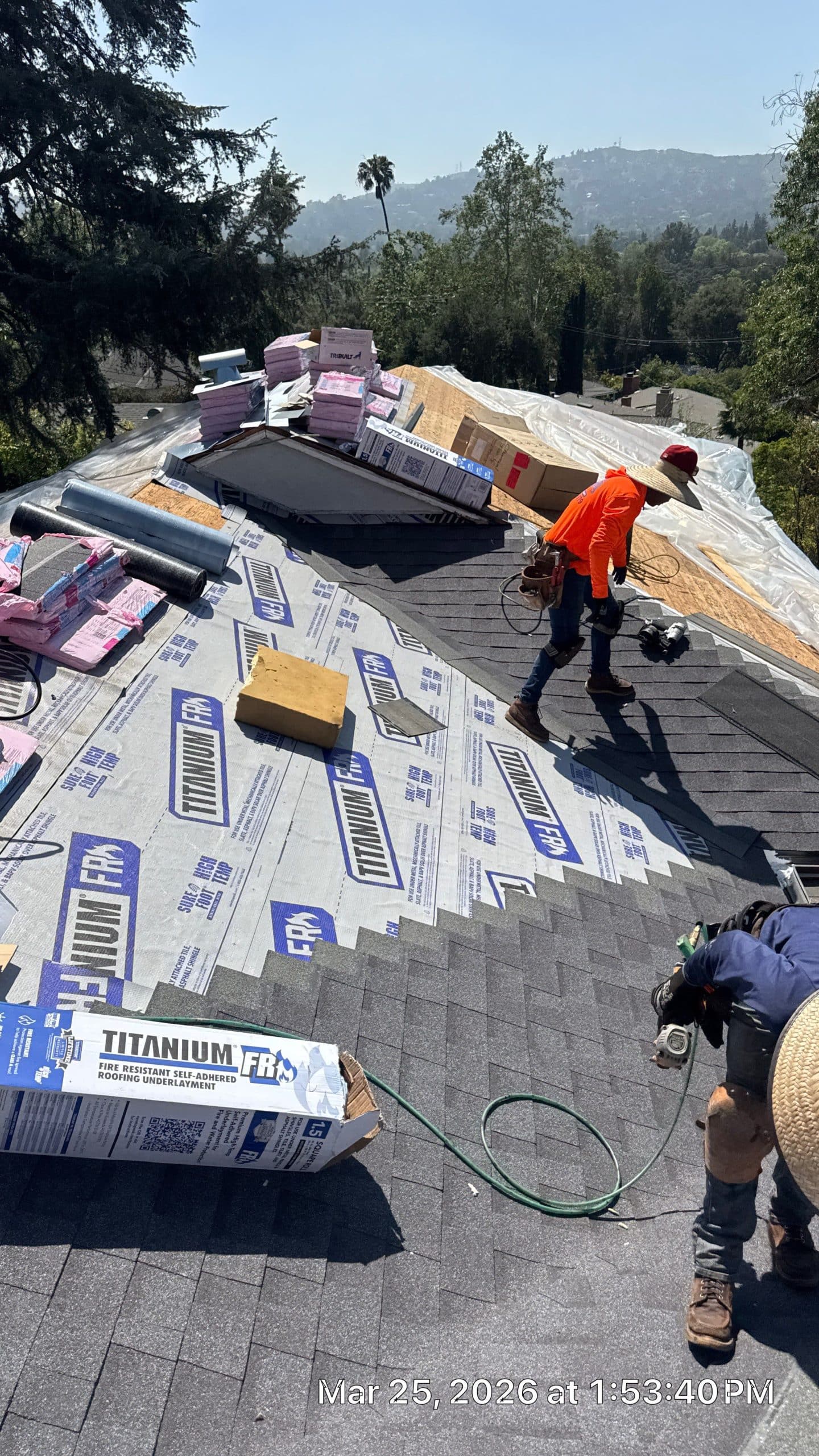 With the deck prepared, the team installed Titanium FR, a fire-resistant self-adhered synthetic roofing underlayment, across all pitched roof surfaces. The product labeling visible in multiple photos confirms it is rated for high-temperature exposure and designed for use as a standalone underlayment under asphalt shingles. Rolls were lapped and positioned to shed water correctly from ridge to eave, and the material was mechanically fastened as well as self-adhered. In lower-slope transition areas and around the skylights, additional layers of sheet membrane were applied before the field underlayment.