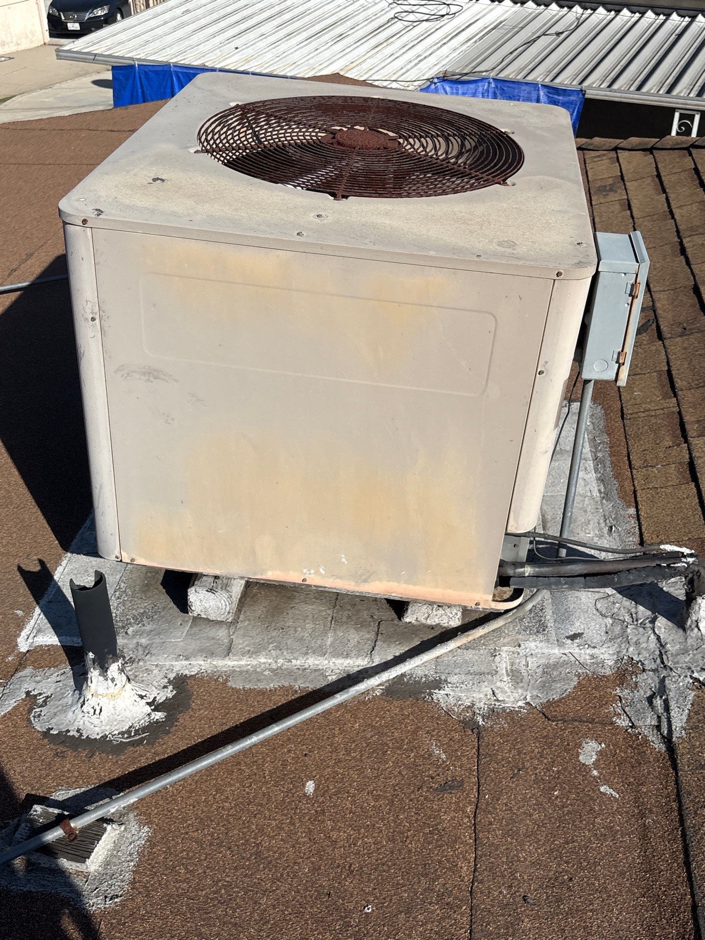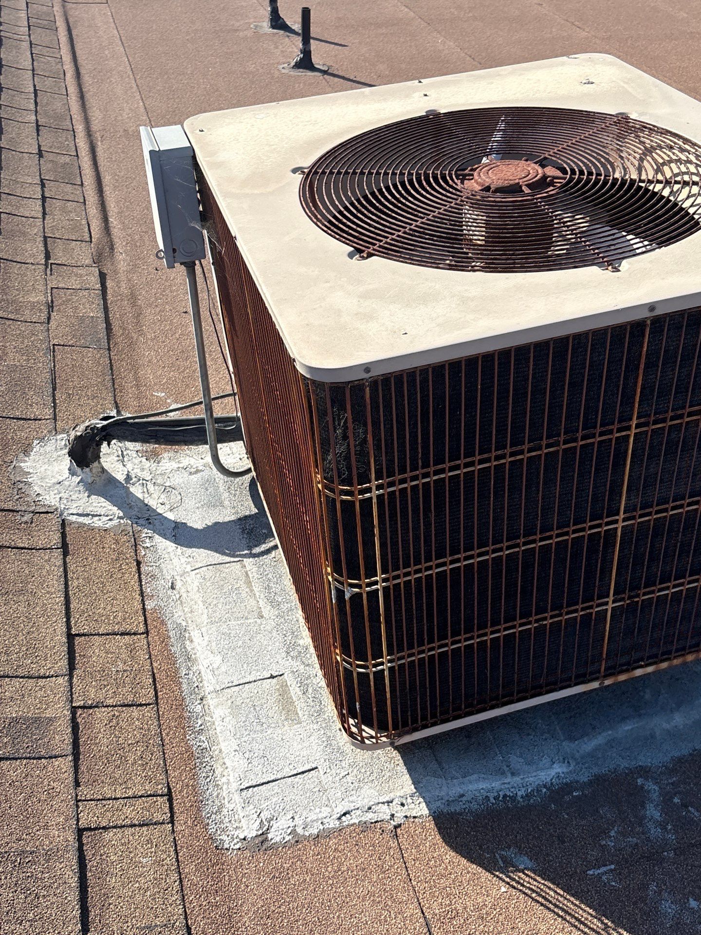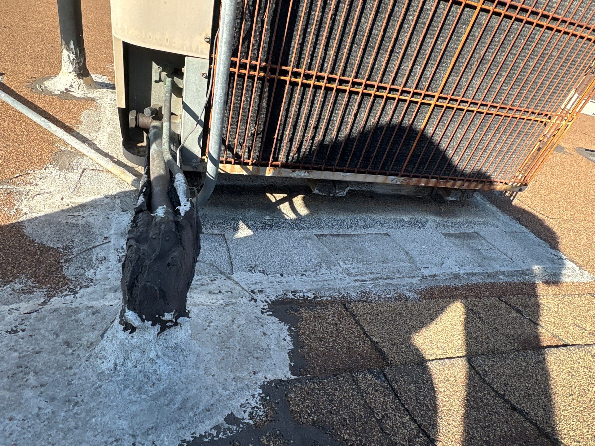 During the initial inspection, we identified aging asphalt shingles, worn-out flat roof materials, and several vulnerable penetration points. Areas around HVAC equipment, plumbing vents, and conduit lines showed old sealants and patchwork repairs that no longer provided reliable protection. The chimney base also exhibited deteriorated flashing and mortar issues.