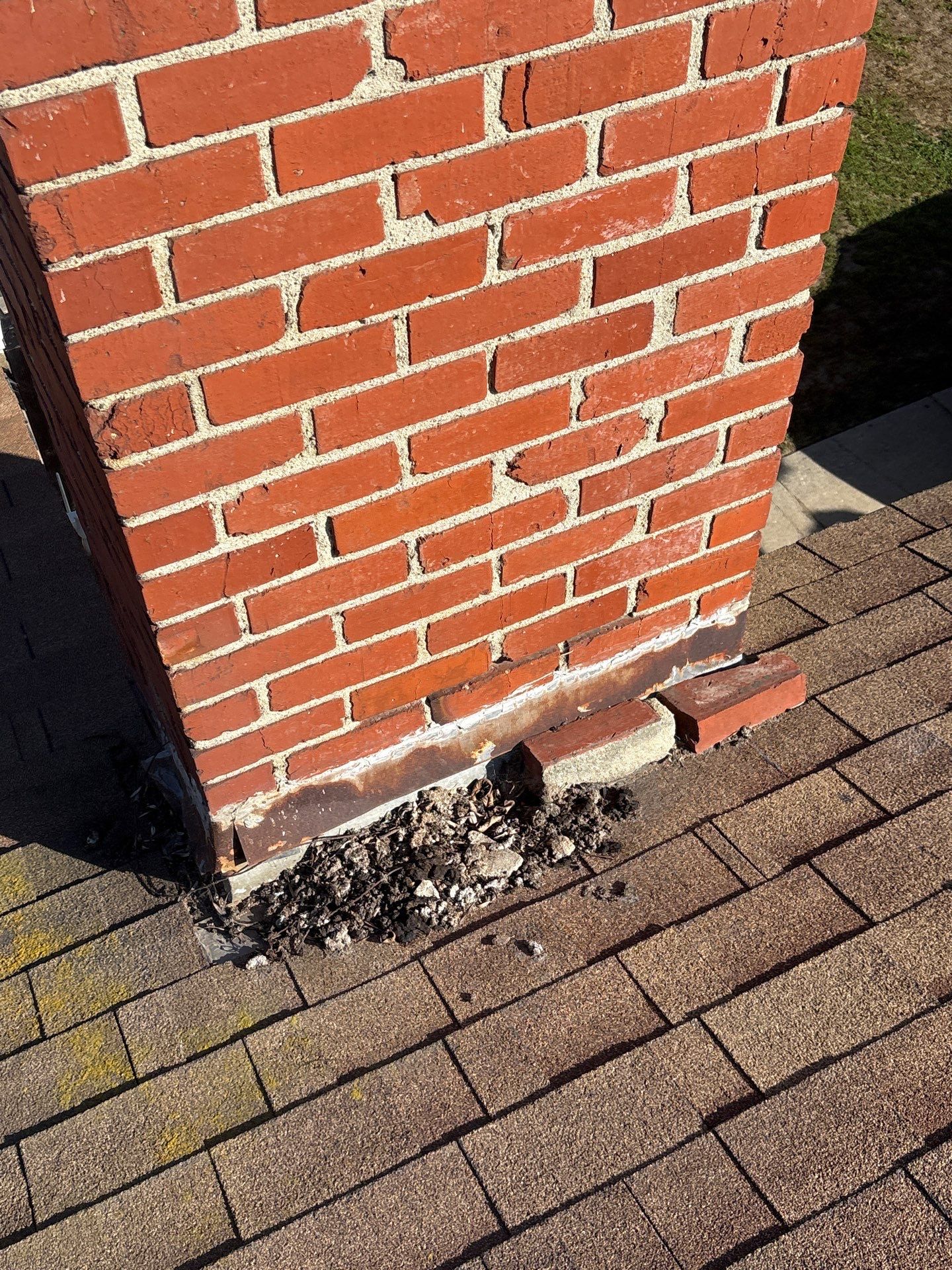 The chimney area received focused attention, including removal of failing materials and installation of new flashing to properly channel water away from the structure. Loose debris and deteriorated mortar at the base were addressed to reduce the risk of future moisture intrusion.